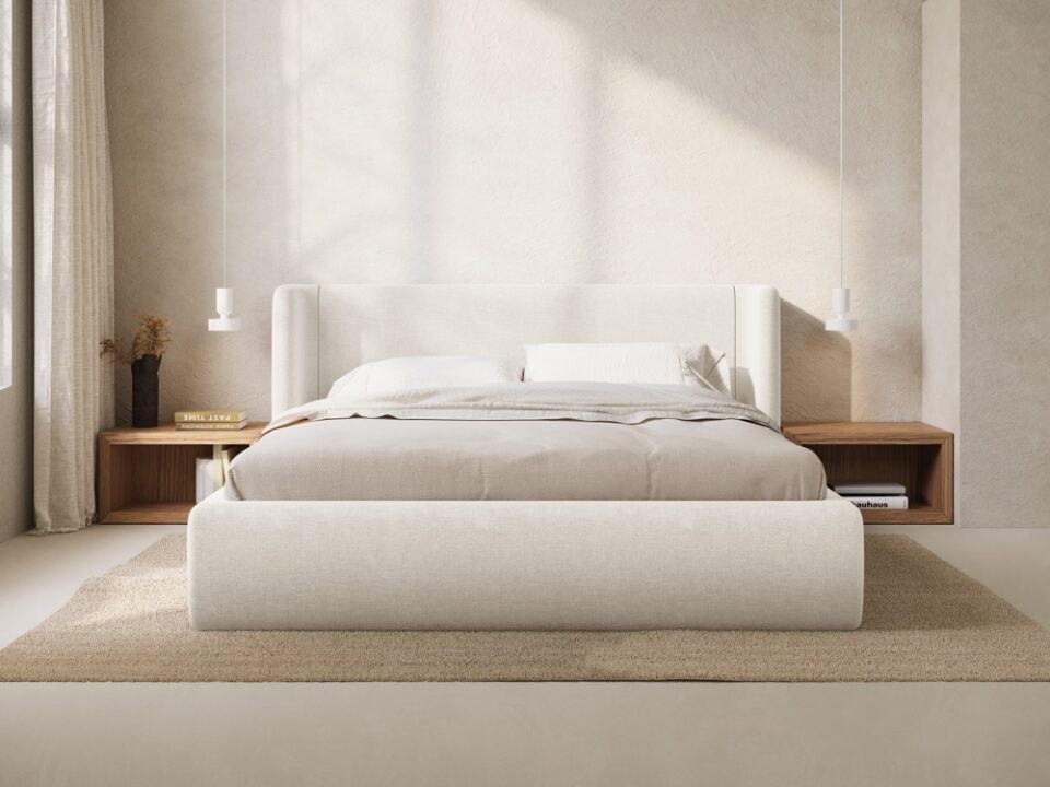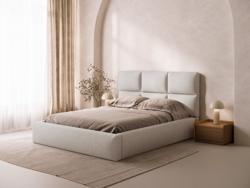 Diseño envolvente, respaldo en bloques y tapizado suave que aporta elegancia y serenidad al dormitorio.