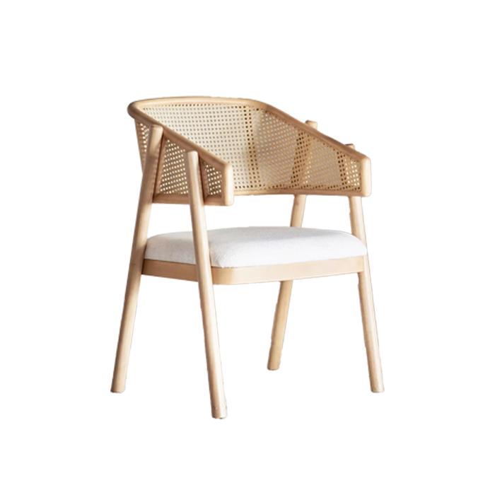 Diseño escandinavo con respaldo en rejilla y asiento tapizado. Ligera, elegante y muy cómoda.