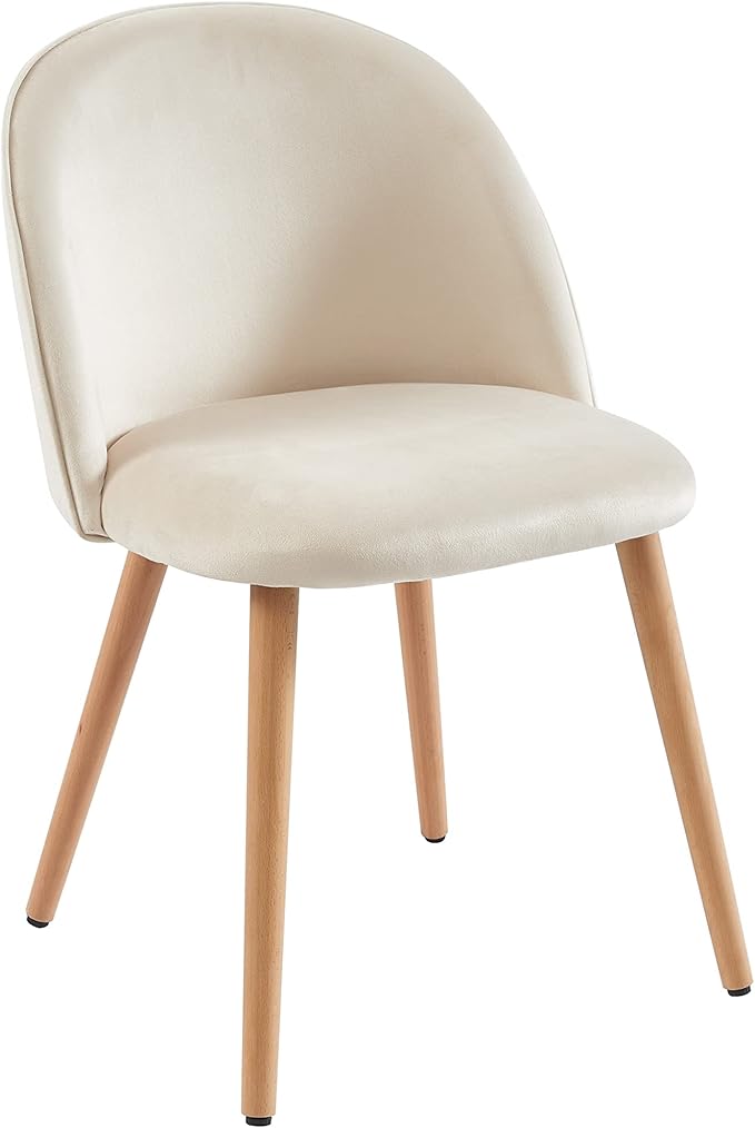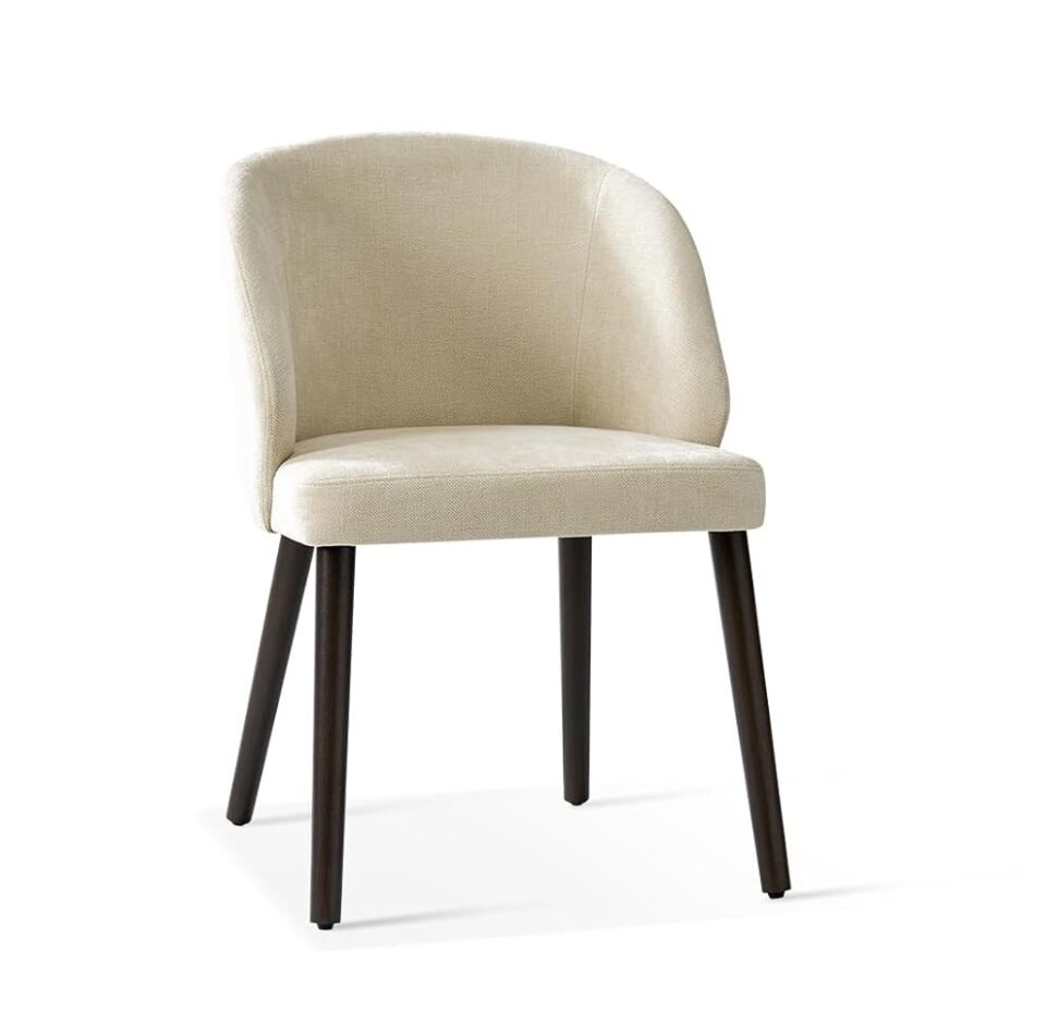 Silla tapizada con respaldo envolvente y patas cónicas de madera. Un acento cálido y sofisticado para tu espacio.