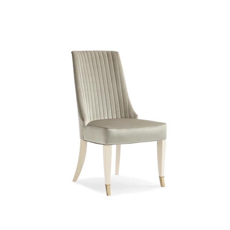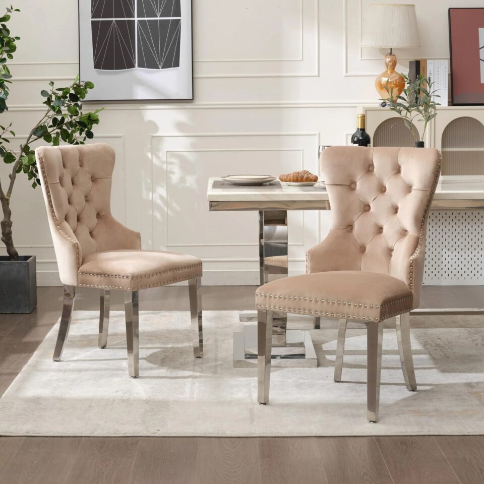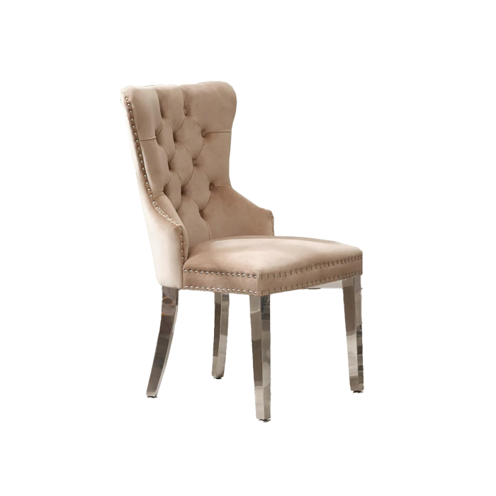 Una silla glamorosa y sofisticada con capitoné, detalles metálicos y tapizado aterciopelado en tono champagne.