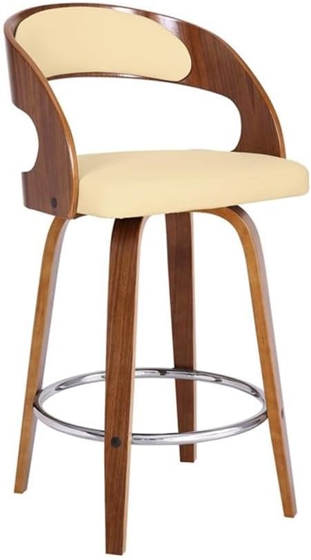 Diseño escandinavo y confort funcional en un taburete giratorio de madera con asiento acolchado y aro metálico.