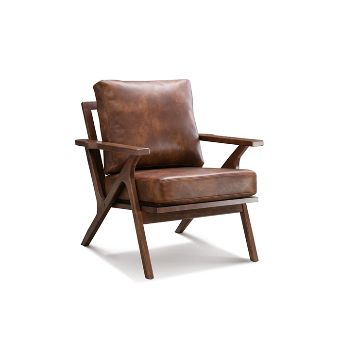 Sillón de diseño mid-century con estructura de madera maciza y cojines de cuero envejecido. Ideal para salas con carácter.